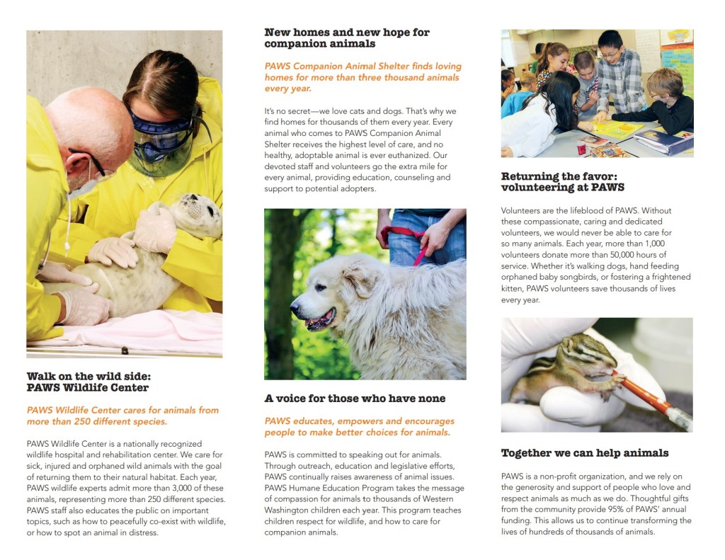 It’s very simple, really. We love and respect animals. And whether they walk, swim, or soar across the skies—we’ve been the Northwest leader in caring for them since 1967. We provide them with food and shelter, nurse them when they’re ill or injured, and find them homes when they’re orphaned or abandoned. We give animals a voice through education and legislation. Simply put—we are “people helping animals.”